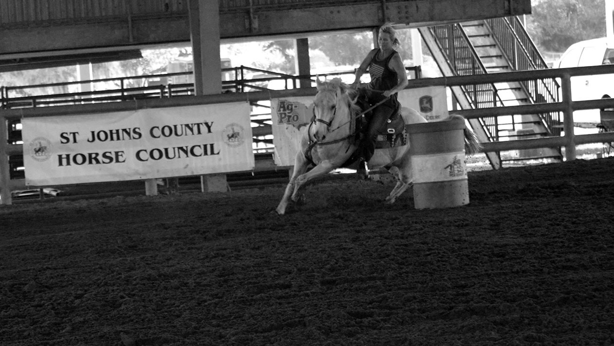 Robin Rawles and her horse, Blu race in the monhtly Barrel Races for the first time at the St. John’s County Fairgrounds on Oct. 6, 2019. Rawles and Blue finished Grand Champion overall in the seasoned adults division.